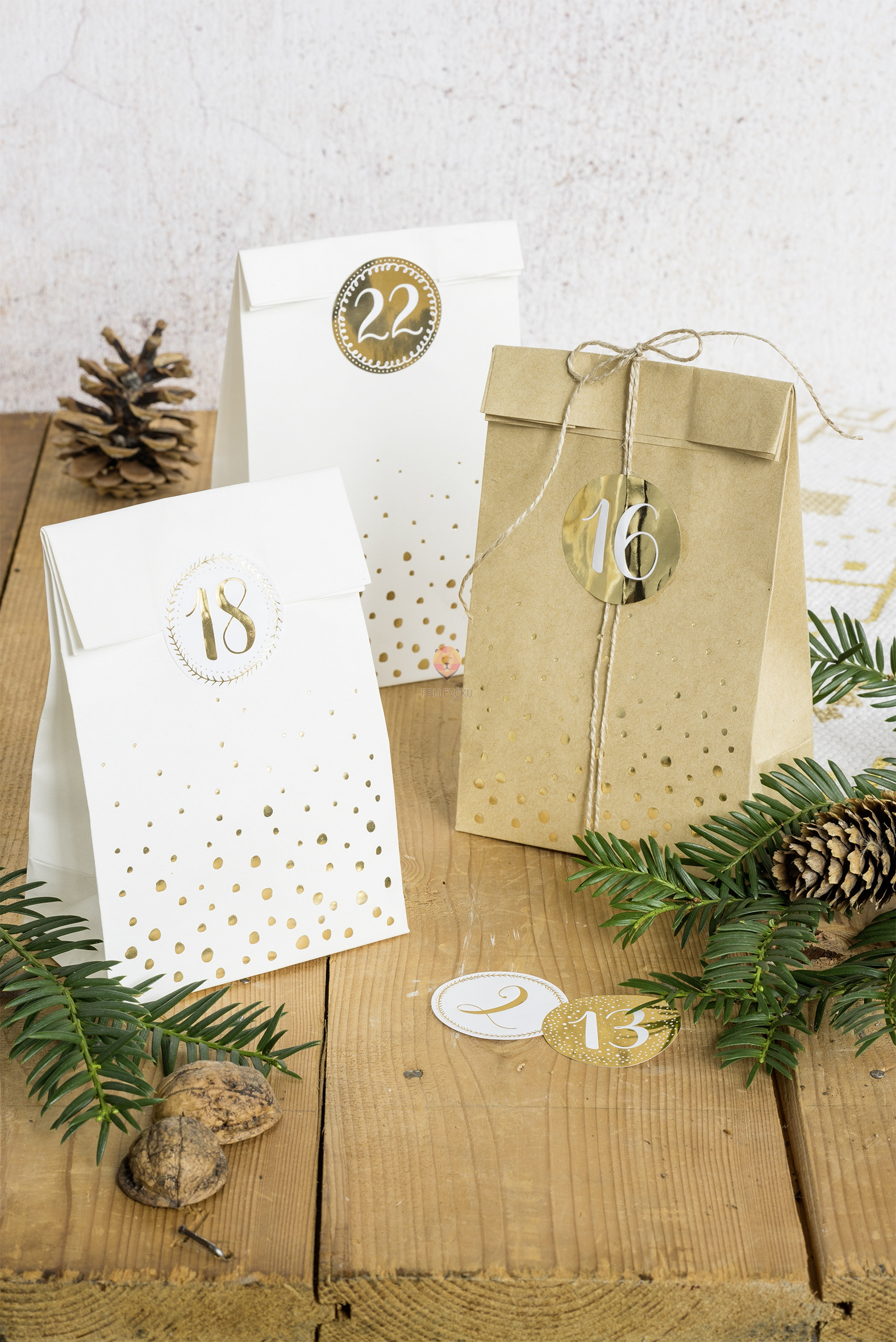 Adventni koledar papirnate vrečke z zlatimi pikami srednji 48-delni
