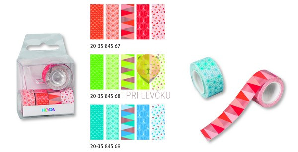 Set petih barvno in tematsko usklajenih dekorativnih lepilnih trakov s plasičnim podajalnikom za lažje trganje.