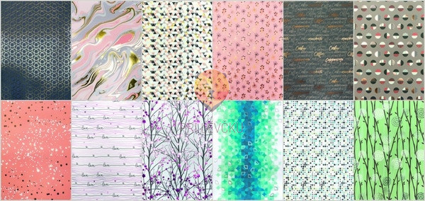 Pakiranje: 12 listov formata A4 v različnih vzorcih in potiskih.