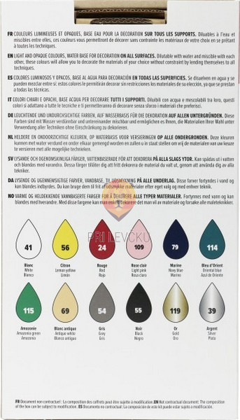 Set intenzivnih in prekrilvnih akrilnih barv na vodni osnovi. Primerne za ustvarjanje tako zunaj kot znotraj, saj lahko z njimi spremenite vse od podstrešja do kleti, zidov in pohištva. Primerne za vse tehnike in večino površi: les, mavec, karton, kovina, slano testo, kamen, papir...