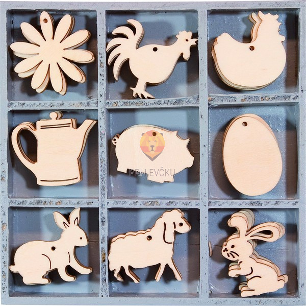 Leseni okraski z motivi domačih živali in vrta. V barvi naravnega lesa.