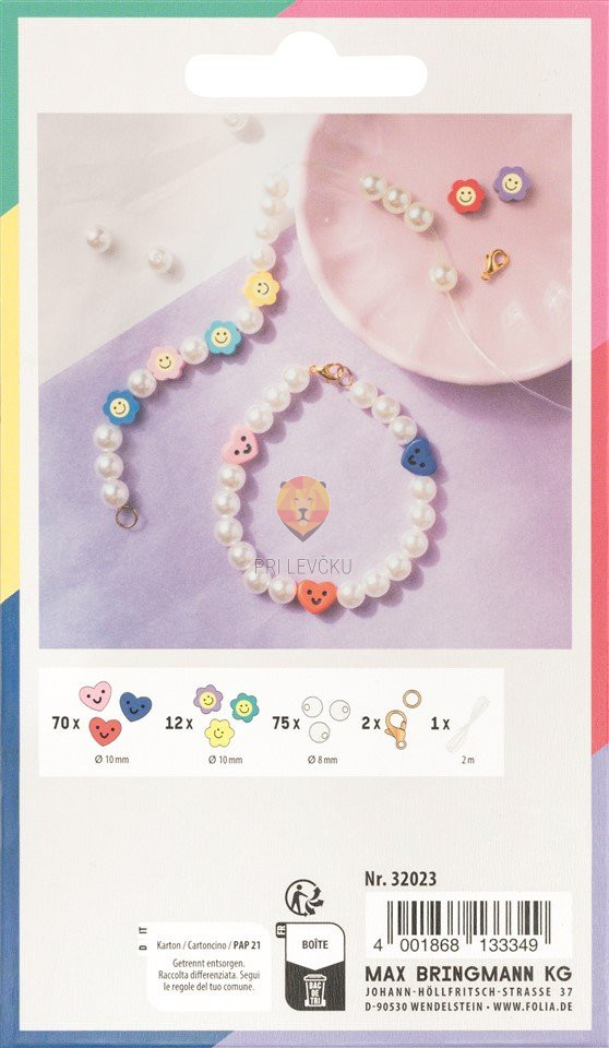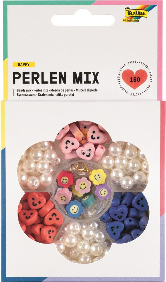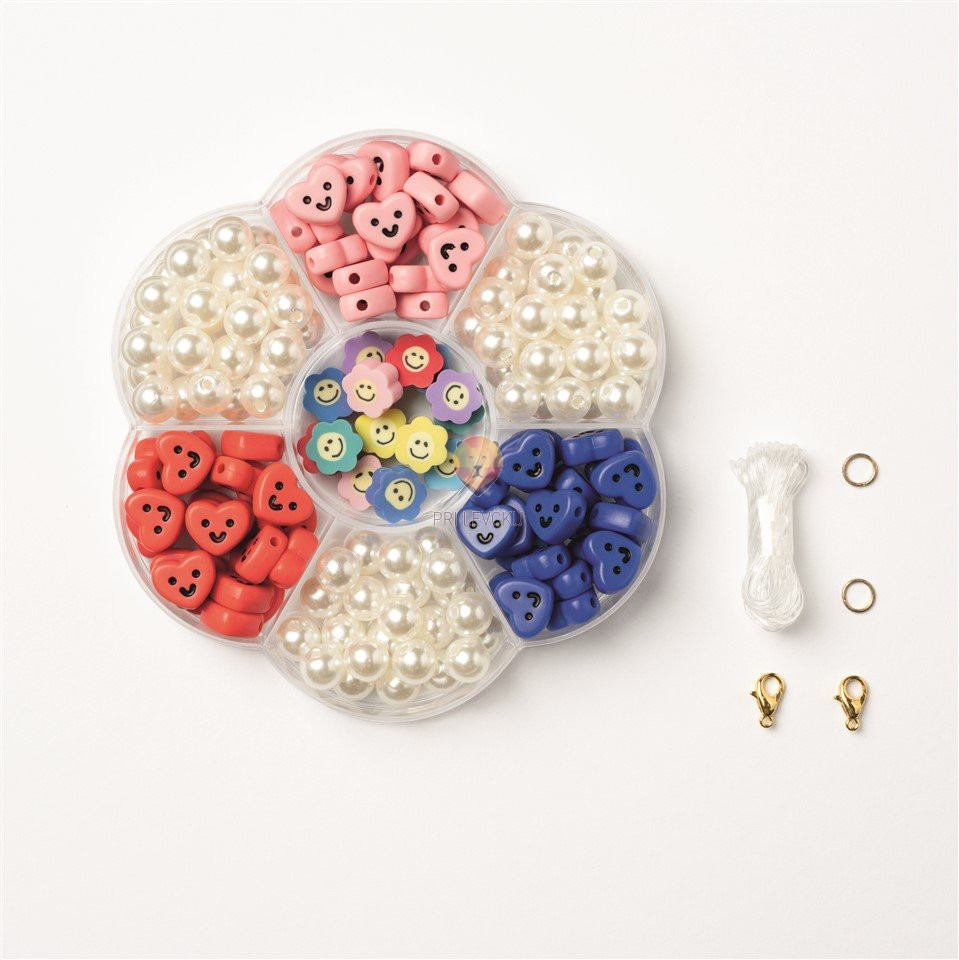 Naj vaš nakit zasije z mešanico pozitivnih vibracij! Komplet HAPPY vsebuje vse, kar potrebujete za ustvarjanje unikatnih ogrlic, prstanov in zapestnic. V njem boste našli 160 pisanih kosov – od igrivih "happy" perlic, modnih okrasnih perlic, barvitih marjetic, do zlatega obročka in karabina.