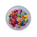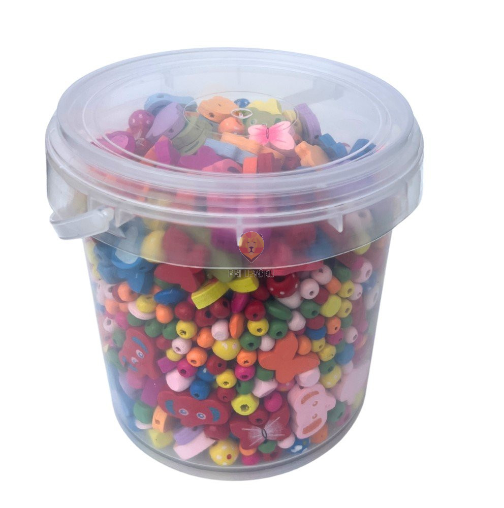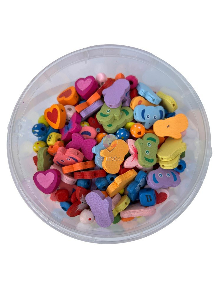 Vsebina: 300 g lesenih perl v različnih barvah in oblikah, pakirano v praktičnem prozornem lončku s pokrovom.