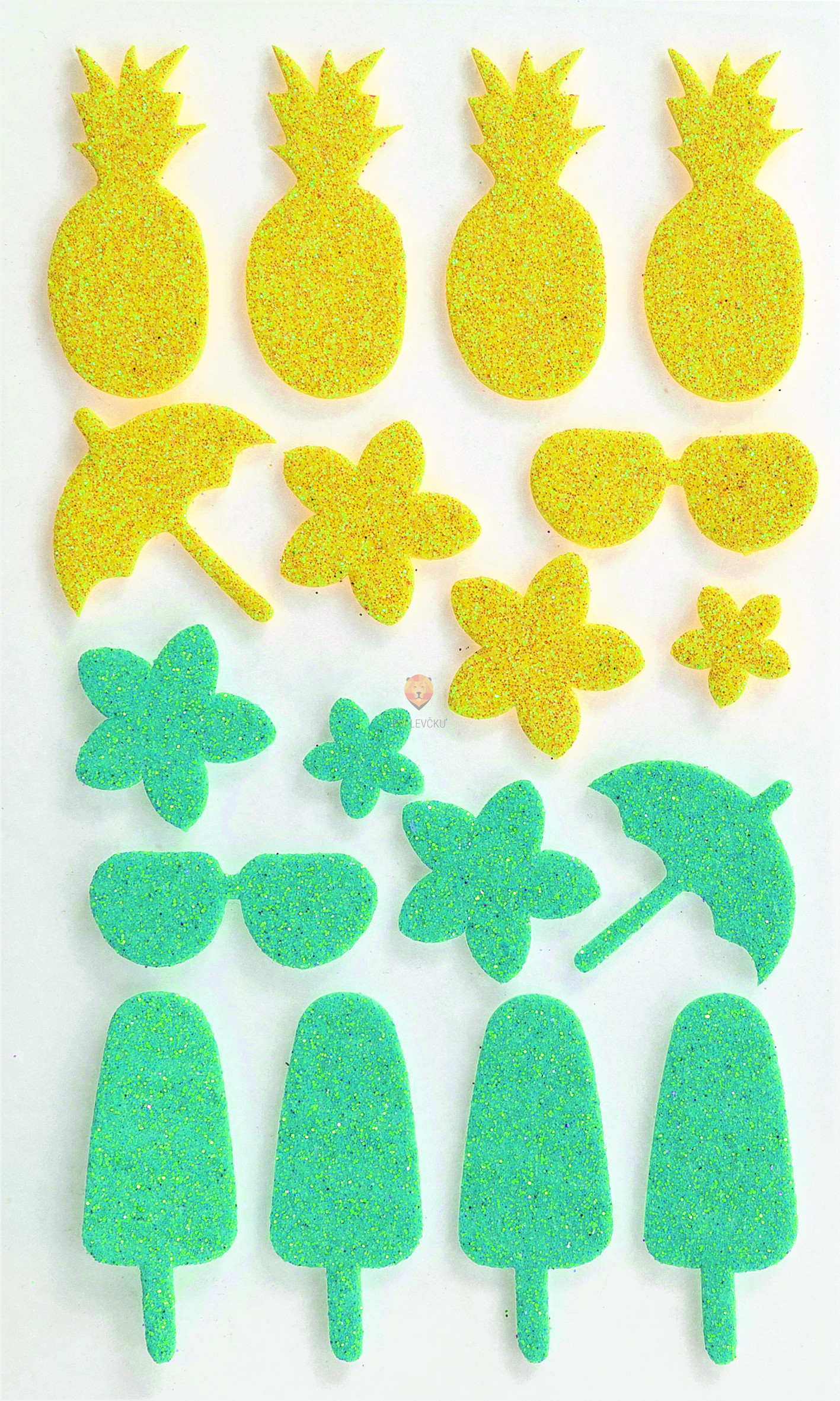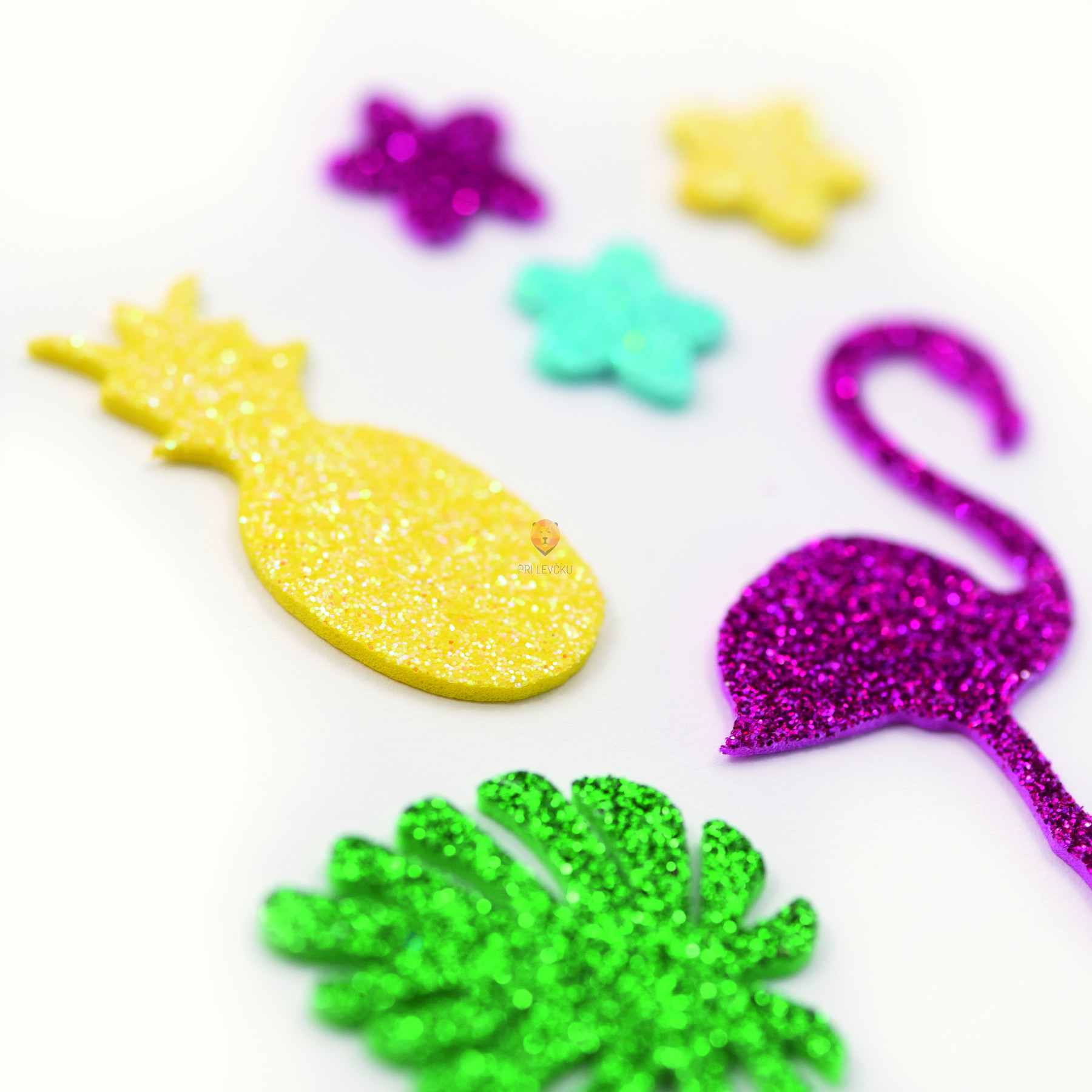 Nalepke iz mehkega moos gumija z bleščicami. V priljubljenih motivih poletja - flamingih, palmah, ananasih, ...