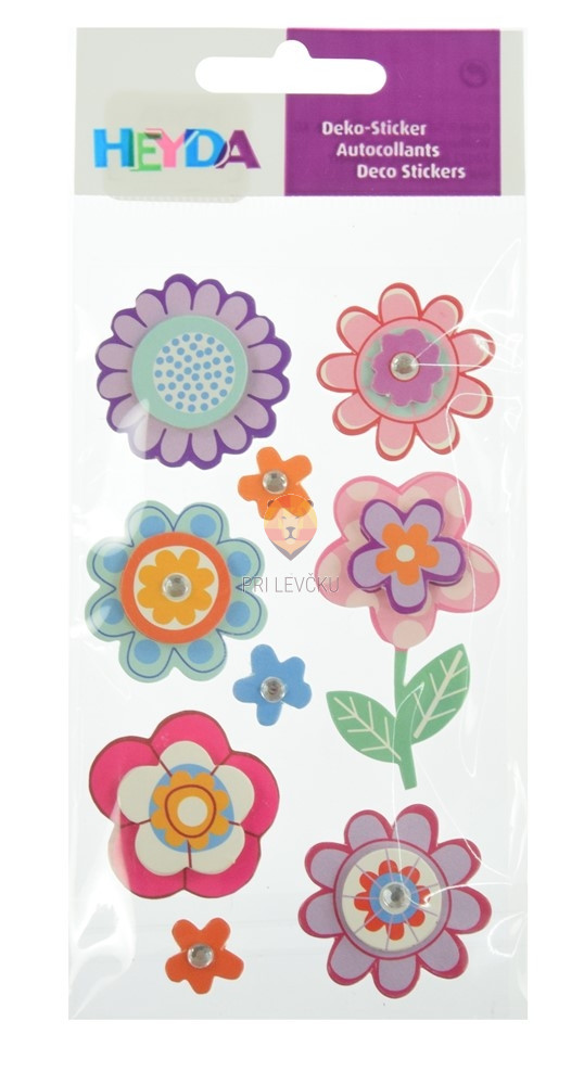 Pola vsebuje rožice 6 velikih rožic in 3 male. V 3D prekrivajočem videzu, okrašene s svetlečimi kamenčki. V roza, vijoličini in modri barvi.