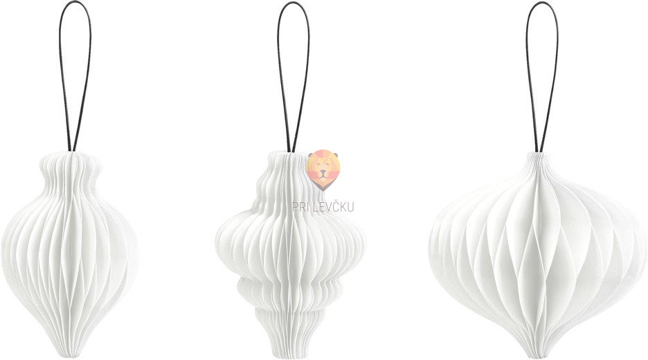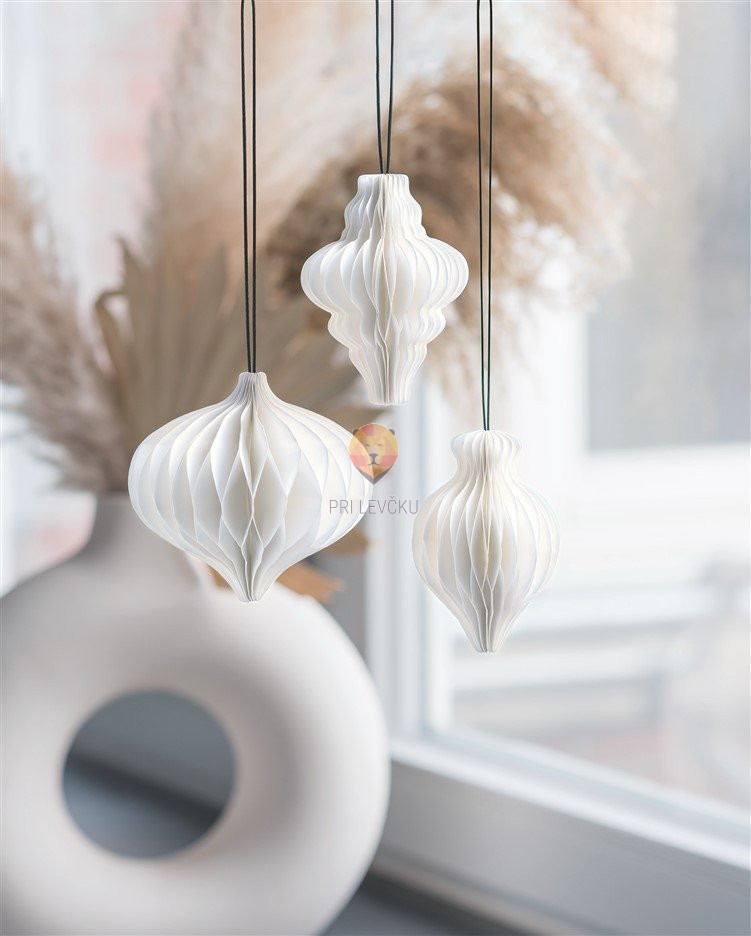 Elegantni papirnati obeski iz satovja v obliki kapljic bodo tvojo praznično dekoracijo spremenili v pravo zimsko pravljico. V kompletu so tri bele kapljaste oblike različnih velikosti (višina cca 10 cm), izdelane iz 120 g papirja z značilno satasto strukturo, ki ustvari zračen, prostorski videz.