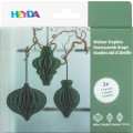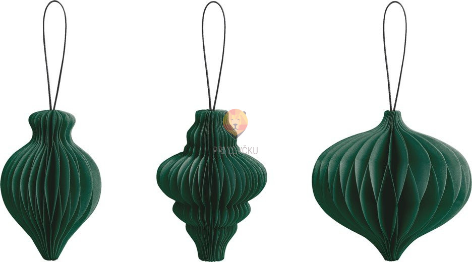 Komplet vsebuje tri papirnate obeske iz satovja v obliki kapljic različnih velikosti (višina cca 10 cm), izdelane iz 120 g papirja v razkošnem temno zelenem odtenku. Satasta struktura ustvari čudovit tridimenzionalen videz, ki se ujema z vsako praznično dekoracijo.