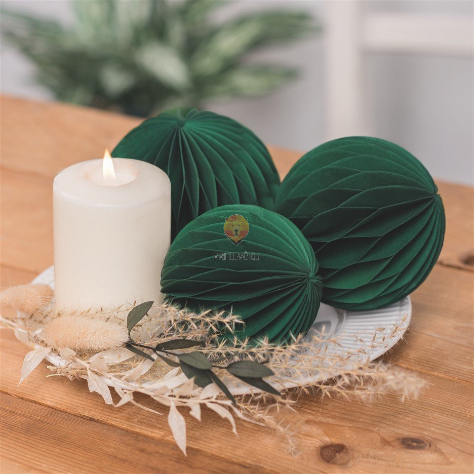 Komplet treh papirnatih krogel iz satovja v globokem zelenem odtenku doda tvoji praznični dekoraciji občutek topline, narave in prefinjenosti. Kroglice različnih velikosti (Ø 8, 9 in 10 cm) so izdelane iz kakovostnega 120 g papirja, ki s satasto strukturo ustvari čudovit prostorski učinek.