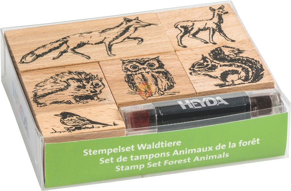 6 lesenih štampiljk z motivi gozdnih živali: lisica, ježek, sova, veverica, srnica, ptiček in 1 blazinica