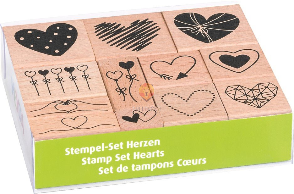 Pakiranje: 12 lesenih štampiljk z različnimi motivi srčkov