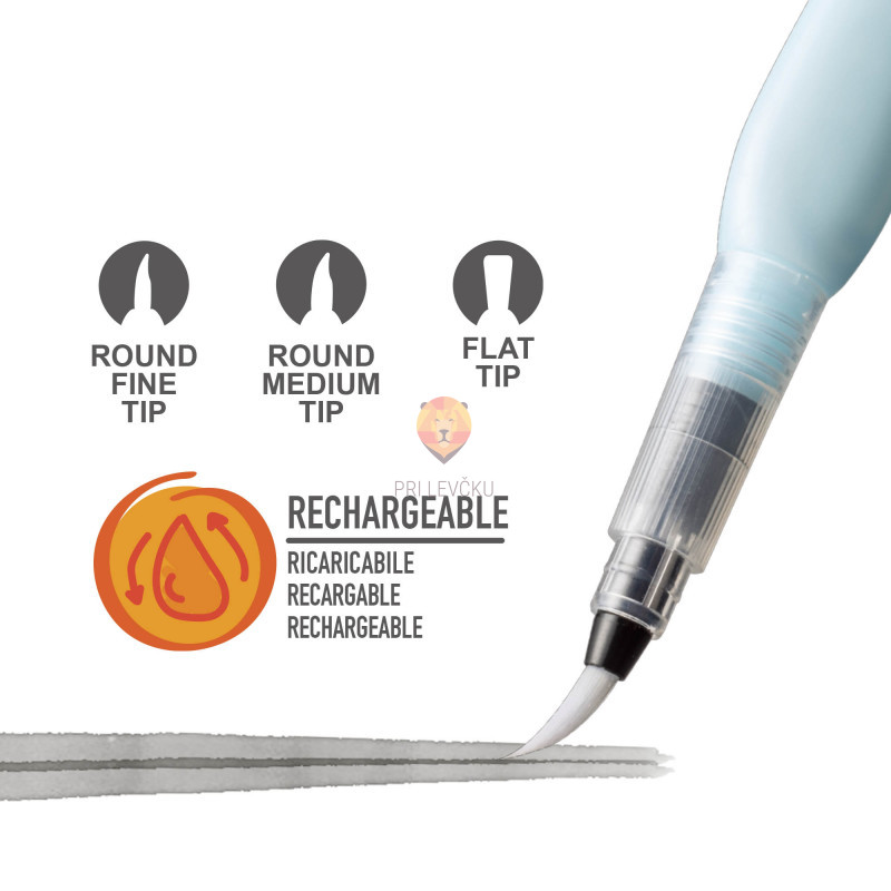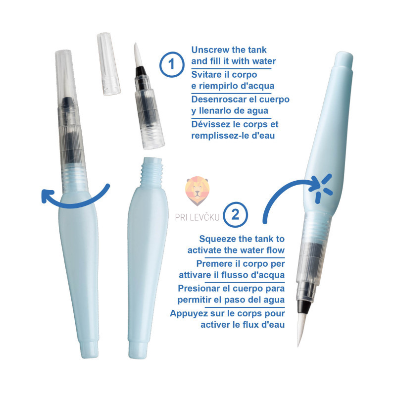 Plastični rezervoar preprosto odvijte in ga napolnite z vodo. S pritiskanjem na osrednji držalni del čopiča nadzirate tok vode. Čopič lahko napolnite tudi s tuši ali z visoko tekočimi in razredčenimi barvami. Konico začitite s priloženim pokrovčkom.