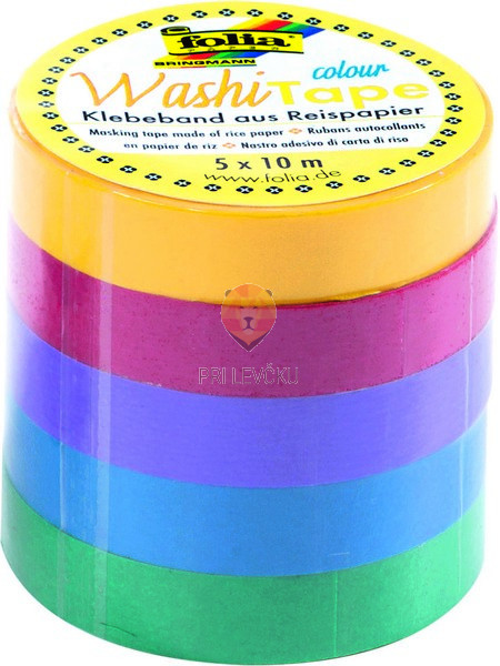 Washi lepilni trakovi v barvno usklajenem setu. Set vsebuje 5 kolutov barvnega lepilnega traku iz riževega papirja, širina vsakega je 10 mm, dolžina na kolutu je 10 m.