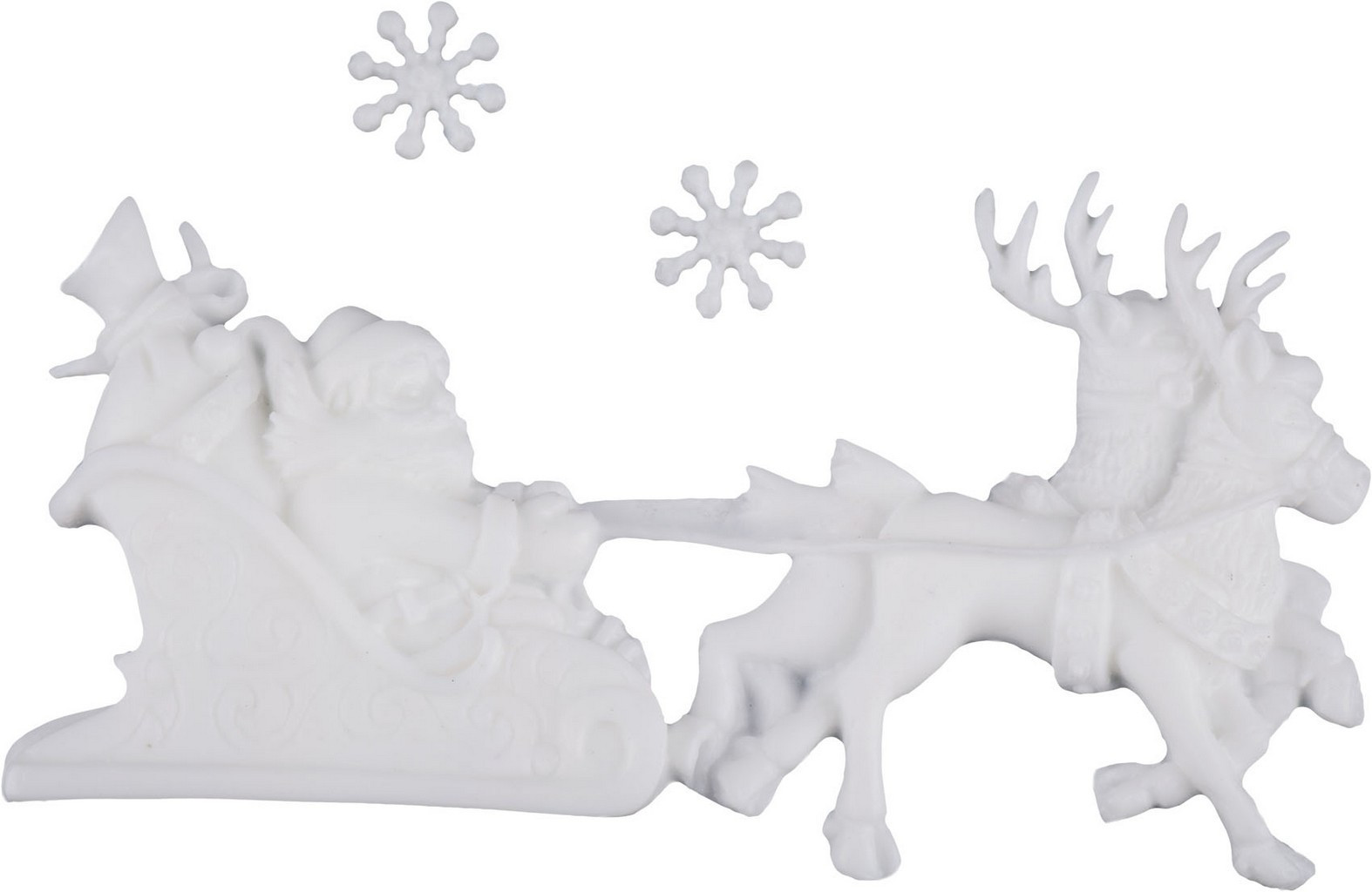 V obliki božička na saneh z jeleni in dveh snežink. Dimenzije premra odlitka cca 11 x 6 x 1 cm. Velikost premers snežink je cca 1,5 cm.
