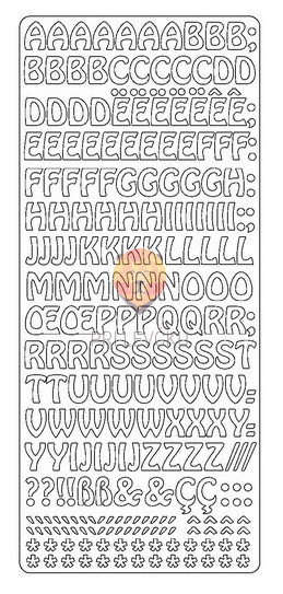 Dekorativne nalepke v obliki črk, nekaj ločil in zvezdic. Višina posamezne črke je 15 mm.