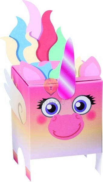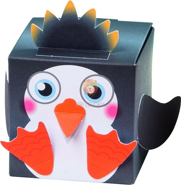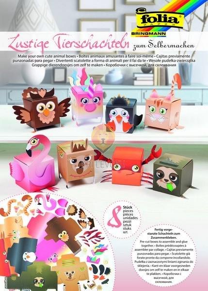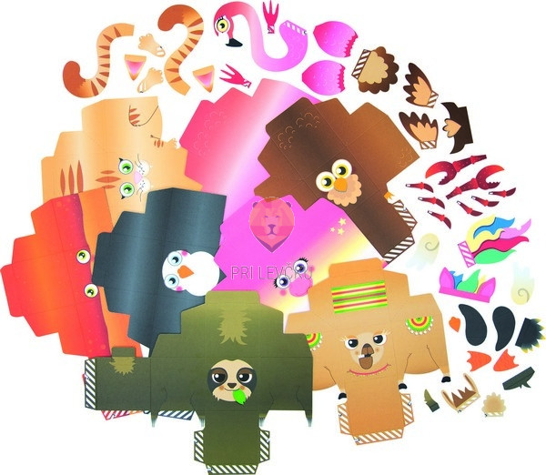 Set, ki vsebuje ves potreben material za izdelavo 8 kartonastih škatlic v podobi sovice, samoroga, pingvina, mucke, flaminga, lame, raka in lenivca. Idealne kot darilna embalaža, vendar niso primerne za polnjenje s težjimi pedmeti.