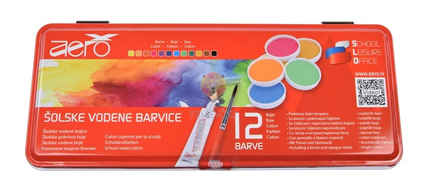 Pakiranje: 12 vodenih barv, tuba tempere bele barve in čopič.